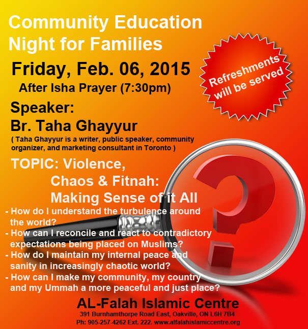 Al-Falah Islamic Centre is inviting you to attend Community Education Night for Families, on Friday Feb. 6th after Isha Prayer at Al-Falah Islamic Centre.